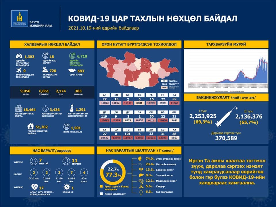 Эрүүл мэндийн яамнаас коронавирусийн халдварын 2021 оны 10 дугаар сарын 19-ний өдрийн тоон мэдээллийг гаргалаа. Энэ өдөр шинээр 1303 хүнээс халдвар илэрчээ. Шинээр батлагдсан тохиолдлуудын 720 нь Улаанбаатарт, 583 нь орон нутагт бүртгэгджээ. Мөн халдварын улмаас 0-80 насны 18 хүн нас барлаа. Ингэснээр нийт нас баралт 1501 болов.