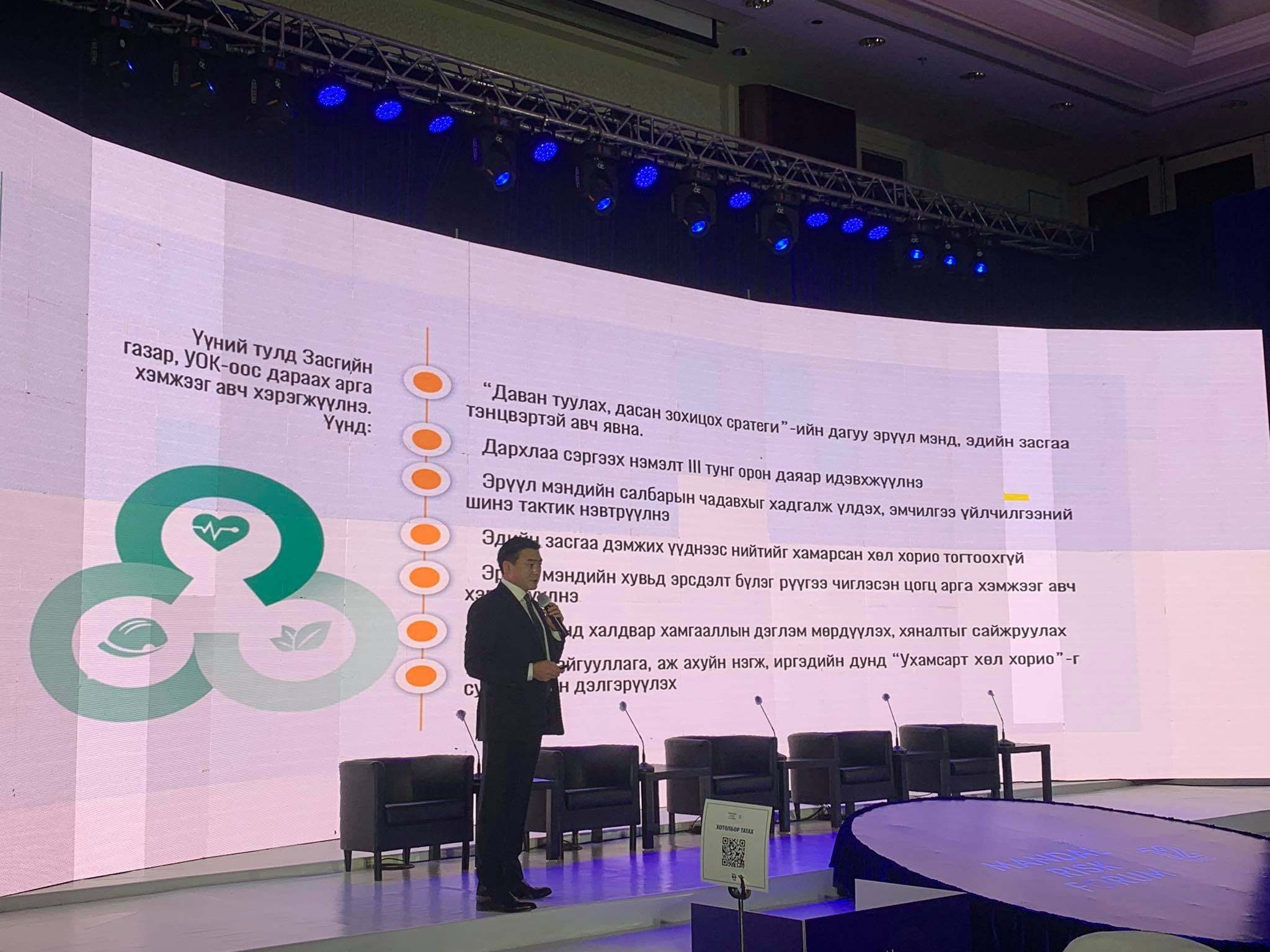 Тэрээр илтгэлдээ нийгэм болон байгалийн эрсдэл, эдийн засгийн эрсдэл гэсэн үндсэн 3 асуудал Монгол Улсад тулгамдаж буйг танилцуулаад, эдгээр эрсдлийг давах туулах чиглэлээр Засгийн газар, Улсын онцгой комиссоос авч хэрэгжүүлж буй зарим арга хэмжээний талаар дурдлаа.