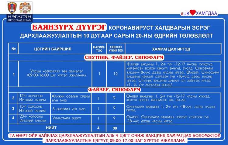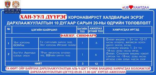 Өнөөдөр Улаанбаатар хотод явуулын 44 баг, суурин 35 цэгт 88 багийн 333 эмч, ажилтан ажиллаж, 5048 иргэнийг дархлаажуулахаар төлөвлөлөө. Та өөрт ойр вакцины аль ч цэгт очиж дархлаажуулалтад хамрагдах боломжтой. Дархлаажуулалтын цэгүүд 09:00-17:00 цаг хүртэл ажиллана. Дархлаажуулалтын цэгийг дүүрэг тус бүрээр танилцуулж байна.