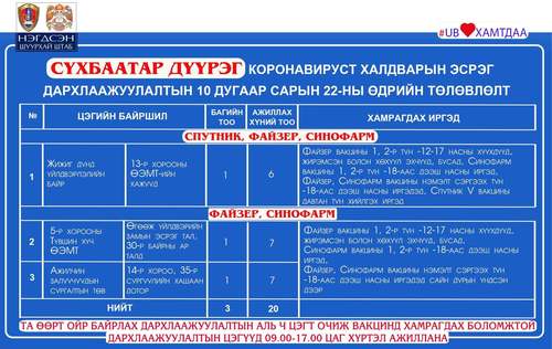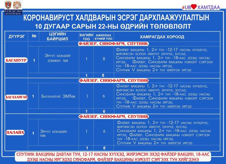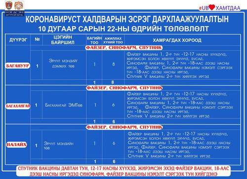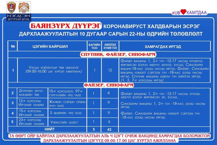 Өнөөдөр Улаанбаатар хотод явуулын 32 баг, суурин 38 цэгт 79 багийн 307 эмч, ажилтан ажиллаж, 4818 иргэнийг дархлаажуулахаар төлөвлөлөө. Та өөрт ойр вакцины аль ч цэгт очиж дархлаажуулалтад хамрагдах боломжтой. Дархлаажуулалтын цэгүүд 09:00-17:00 цаг хүртэл ажиллана. Дархлаажуулалтын цэгийг дүүрэг тус бүрээр танилцуулж байна.