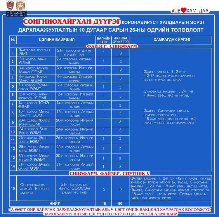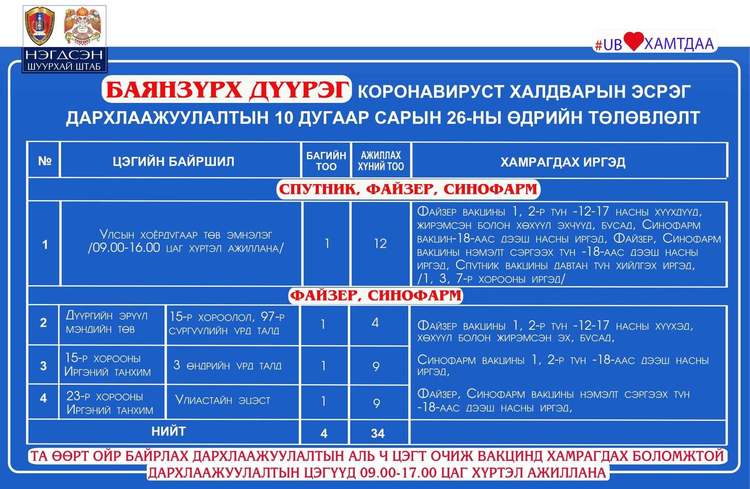Өнөөдөр Улаанбаатар хотод явуулын 36 баг, суурин 36 цэгт 81 багийн 307 эмч, ажилтан ажиллаж, 4148 иргэнийг дархлаажуулахаар төлөвлөлөө. Та өөрт ойр вакцины аль ч цэгт очиж дархлаажуулалтад хамрагдах боломжтой. Дархлаажуулалтын цэгүүд 09:00-17:00 цаг хүртэл ажиллана. Дархлаажуулалтын цэгийг дүүрэг тус бүрээр танилцуулж байна.