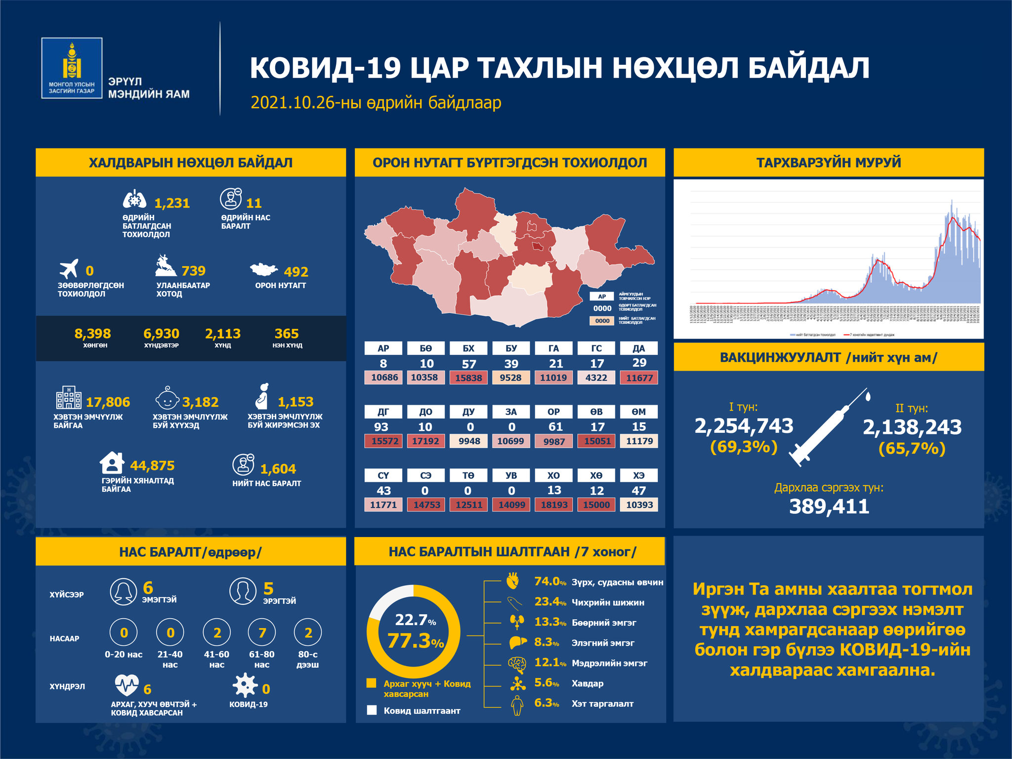Эрүүл мэндийн яам коронавирусийн халдварын 2021 оны 10 дугаар сарын 26-ны өдрийн тоон мэдээллийг гаргалаа. Сүүлийн 24 цагийн хугацаанд шинээр 1231 тохиолдол батлагджээ. Үүний 739 нь Улаанбаатарт, 492 нь орон нутагт бүртгэгдсэн байна. Мөн энэ хугацаанд халдварын улмаас 40-80 насны 11 хүн нас барлаа.