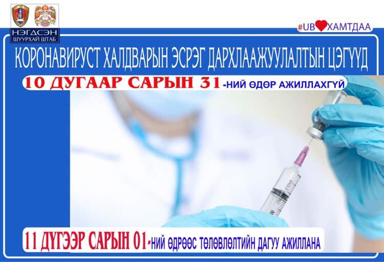 Өчигдөр буюу аравдугаар сарын 30-ны өдрийн нийслэлийн хэмжээнд I тунд 20, II тунд 51, нэмэлт сэргээх тунд 834, нийт 905 иргэнийг дархлаажуулжээ.