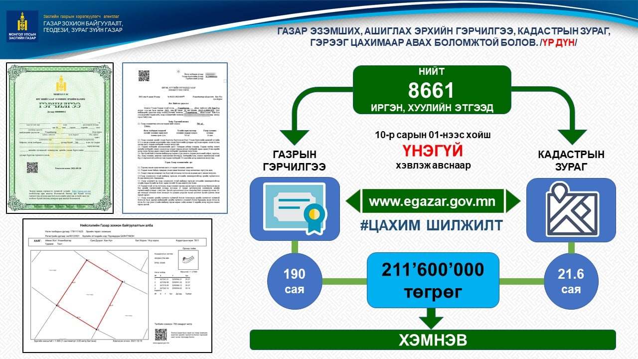 Өнгөрсөн 10-р сарын 1-нээс эхлэн иргэн, хуулийн этгээд захирамж нь гарсан газрын гэрчилгээ, кадастрын зургаа өөрөө үнэ төлбөргүй гэртээ хэвлэж авч, ашиглаж эхэлсэн.