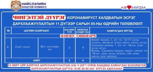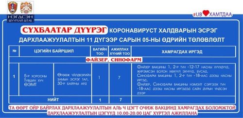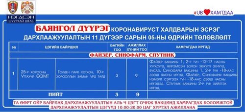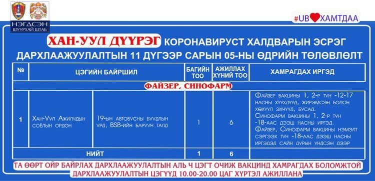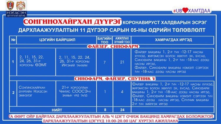 Өнөөдөр Улаанбаатар хотод суурин 16 цэгт 20 багийн 85 эмч, ажилтан ажиллаж, 2978 иргэнийг дархлаажуулахаар төлөвлөлөө. Та өөрт ойр вакцины аль ч цэгт очиж дархлаажуулалтад хамрагдах боломжтой. Дархлаажуулалтын цэгүүд 10:00-20:00 цаг хүртэл ажиллана. Дархлаажуулалтын цэгийг дүүрэг тус бүрээр танилцуулж байна.