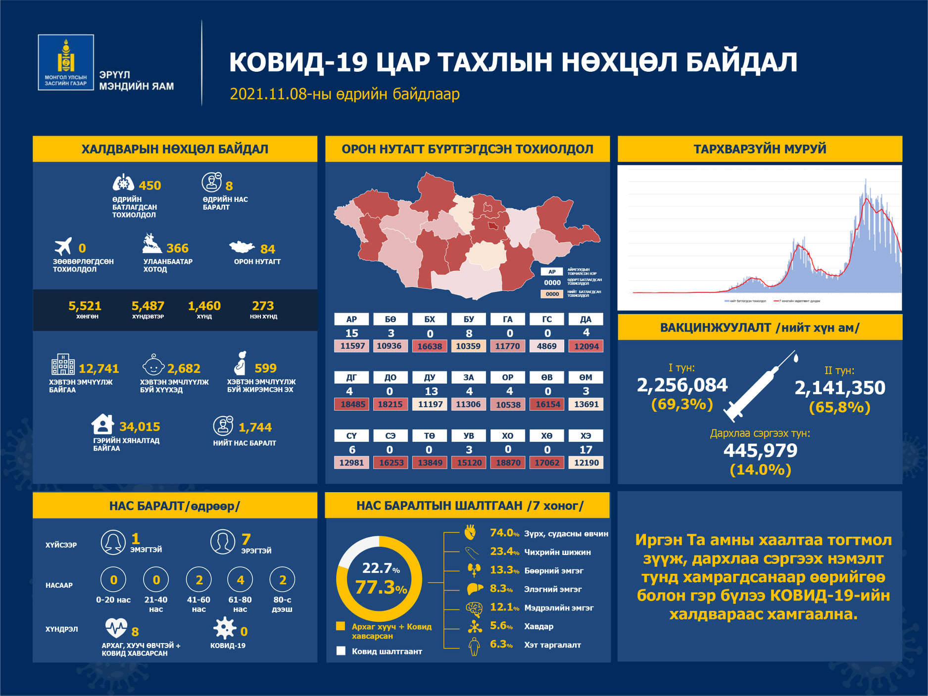 Эрүүл мэндийн яамнаас коронавирусийн халдварын 2021 оны 11 дүгээр сарын 08-ны өдрийн тоон мэдээллийг гаргажээ. Сүүлийн 24 цагийн хугацаанд шинээр 450 тохиолдол шинжилгээгээр батлагдсан байна. Үүний 366 нь Улаанбаатарт, 84 нь орон нутагт бүртгэгджээ. Мөн хугацаанд халдварын улмаас 41-80 насны 8 хүн нас барсан байна.
