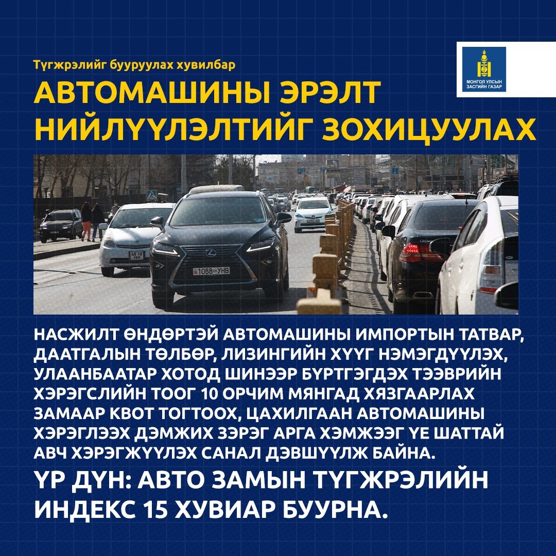 Засгийн газрын хуралдаан үргэлжилж байна. Хуралдаанаар автозамын түгжрэлийг бууруулах хувилбар, автомашины эрэлт нийлүүлэлтийг зохицуулах талаар хэлэлцэж байна.