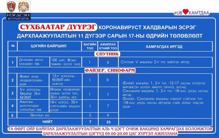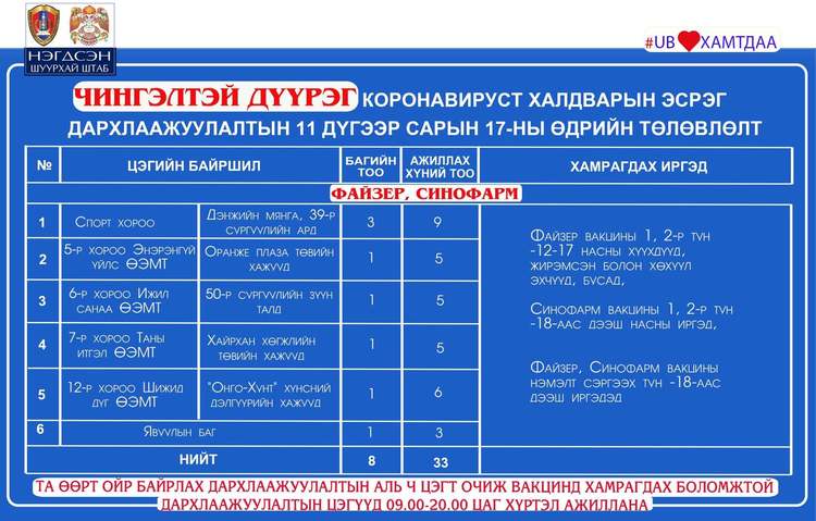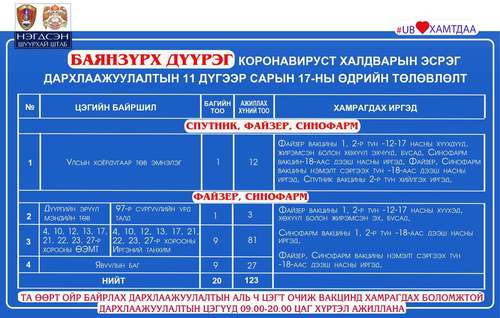 Өнөөдөр Улаанбаатар хотод явуулын 39, суурин 44 цэгт 92 багийн 375 эмч, ажилтан ажиллаж, 5748 иргэнийг дархлаажуулахаар төлөвлөлөө. Та өөрт ойр вакцины аль ч цэгт очиж дархлаажуулалтад хамрагдах боломжтой. Дархлаажуулалтын цэгүүд 09:00-20:00 цаг хүртэл ажиллана.