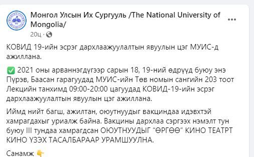 МУИС дархлаажуулалтын нэмэлт тунд хамрагдсан оюутнуудаа кино үзэх тасалбараар урамшуулна. Тодруулбал, маргааш буюу арваннэгдүгээр сарын 18, 19-ний өдрүүдэд МУИС-ийн Төв номын сангийн 203 тоот Лекцийн танхимд 09:00-20:00 цагуудад коронавирусийн эсрэг дархлаажуулалтын явуулын цэг ажиллах гэнэ. Ингэхдээ вакцины дархлаа сэргээх нэмэлт тун буюу III тундаа хамрагдсан оюутнуудыг "Өргөө" кино театрт кино үзэх тасалбараар урамшуулна. Иймд нийт багш, ажилтан, оюутнуудыг вакциндаа идэвхтэй хамрагдахыг уриалж байна.
