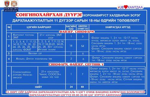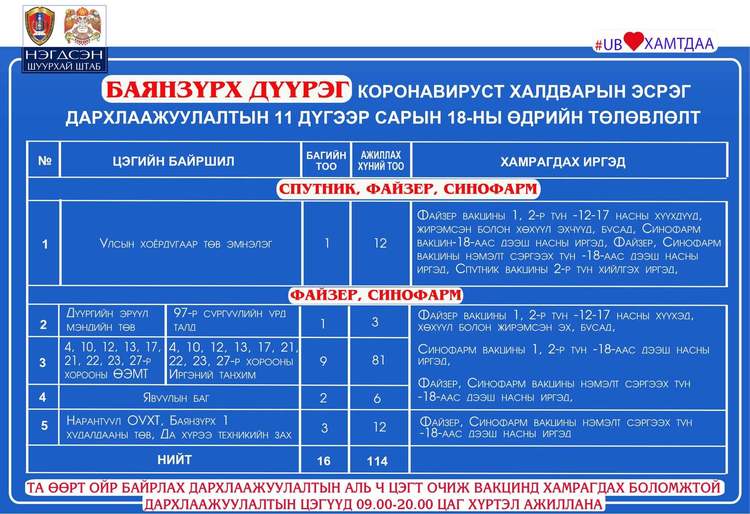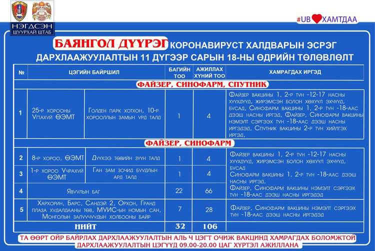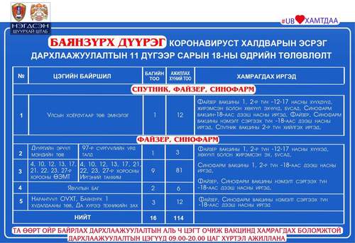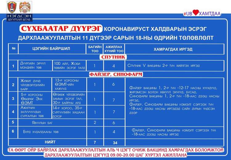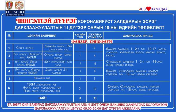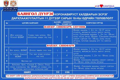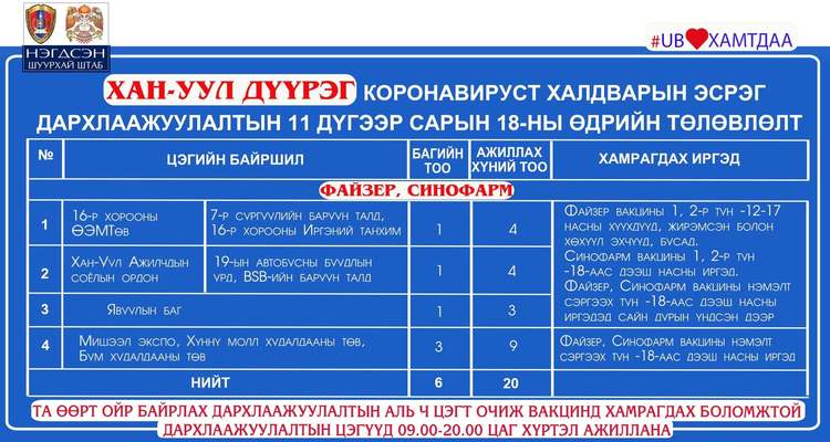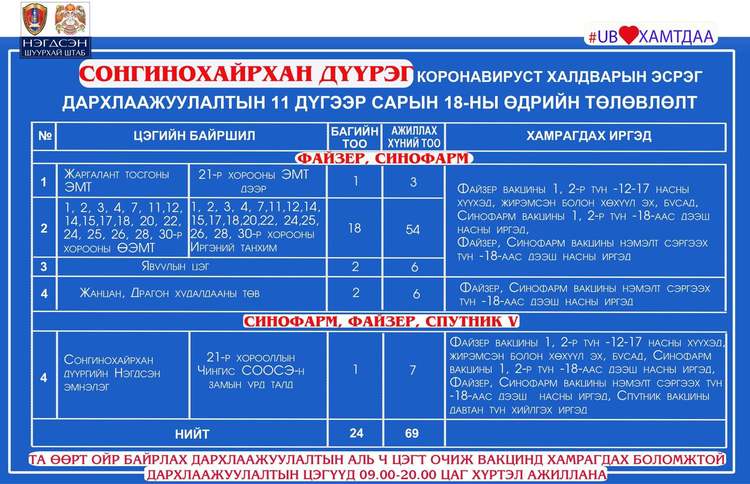 Өнөөдөр Улаанбаатар хотод явуулын 31, суурин 65 цэгт 96 багийн 304 эмч, ажилтан ажиллаж, 5868 иргэнийг дархлаажуулахаар төлөвлөлөө. Та өөрт ойр вакцины аль ч цэгт очиж дархлаажуулалтад хамрагдах боломжтой. Дархлаажуулалтын цэгүүд 09:00-20:00 цаг хүртэл ажиллана. Томоохон зах, худалдааны төвүүдэд 19 цэг нээн ажиллуулж эхэллээ.
