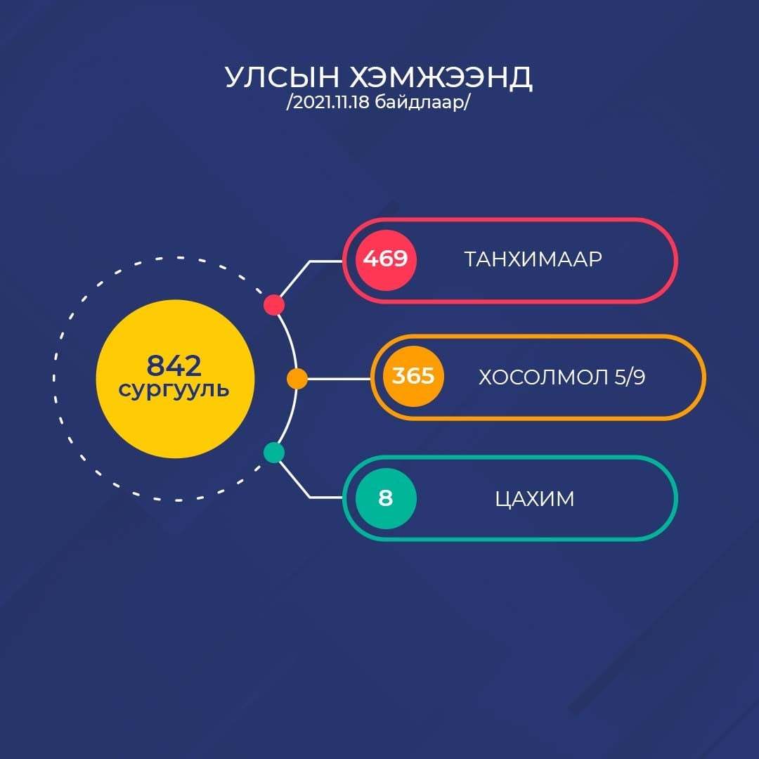 Цар тахлын улмаас хичээл сургалтын үйл ажиллагаа хоёр хичээлийн жил дараалан доголдсон. Харин 2021-2022 оны хичээл жилийг хосолмол байдлаар эхлүүлэх шийдвэр гарч өнөөдрийг хүртэл үргэлжилж байна. Тухайн бүс нутаг ногоон болон шар түвшинд шилжвэл сургууль, цэцэрлэгийн үйл ажиллагааг танхимд шилжүүлэх журамтай. Өчигдрийн байдлаарх улсын хэмжээний статистик мэдээллийг хүргэж байна.