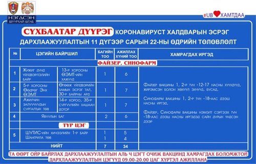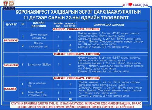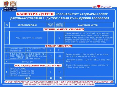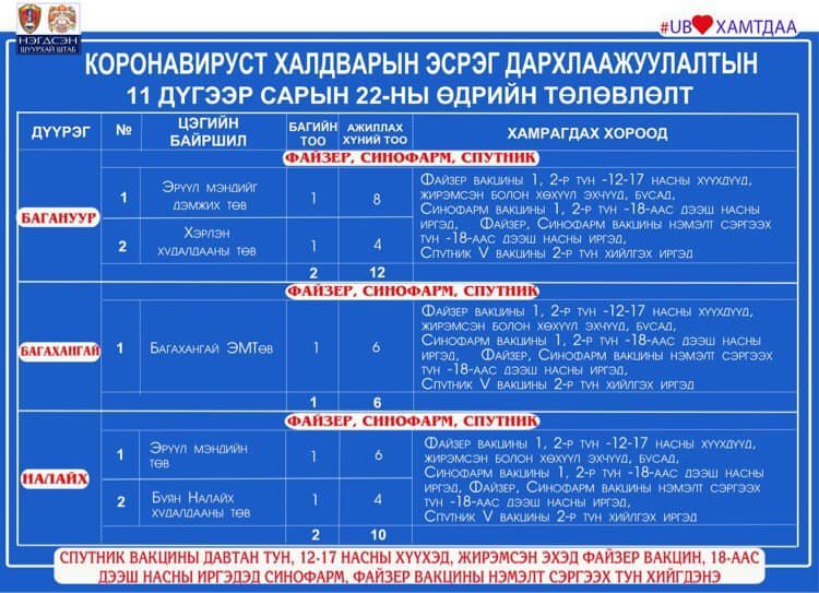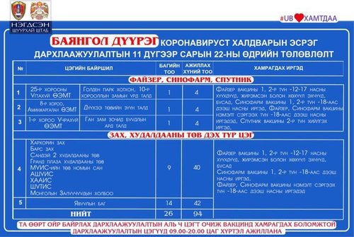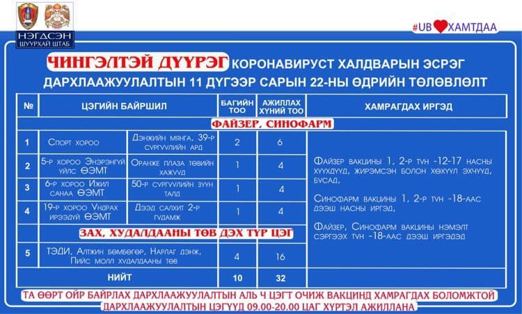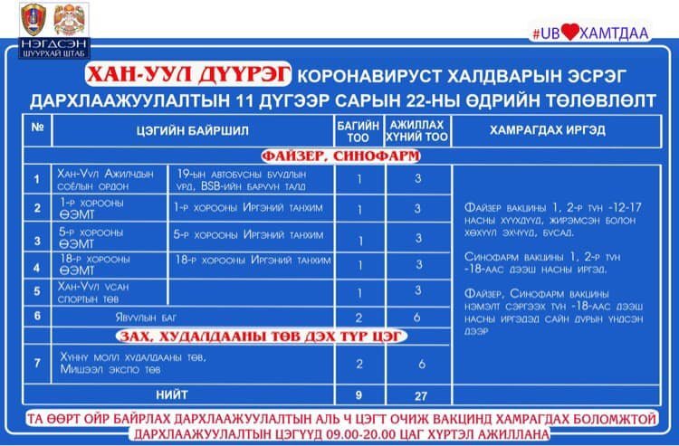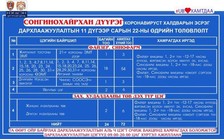Өнөөдөр Улаанбаатар хотод явуулын 23, суурин 52, түр 25 цэгт 102 багийн 436 эмч, ажилтан ажиллаж, 5818 иргэнийг дархлаажуулахаар төлөвлөлөө. Томоохон зах, худалдааны төвүүдэд 25 түр цэг ажиллаж байна. Та өөрт ойр вакцины аль ч цэгт очиж дархлаажуулалтад хамрагдах боломжтой. Дархлаажуулалтын цэгүүд 09:00-20:00 цаг хүртэл ажиллана.