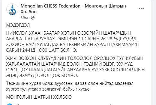 Жич: Зөвхөн клубуудын төлөөлөл оролцох тул клубын харьяалалтай шатарчид болон тэдний эцэг эхчүүд оролцох шаардлагагүйг анхаарна уу. Харин хувь оролцогчдын эцэг эхчүүд оролцож болно.