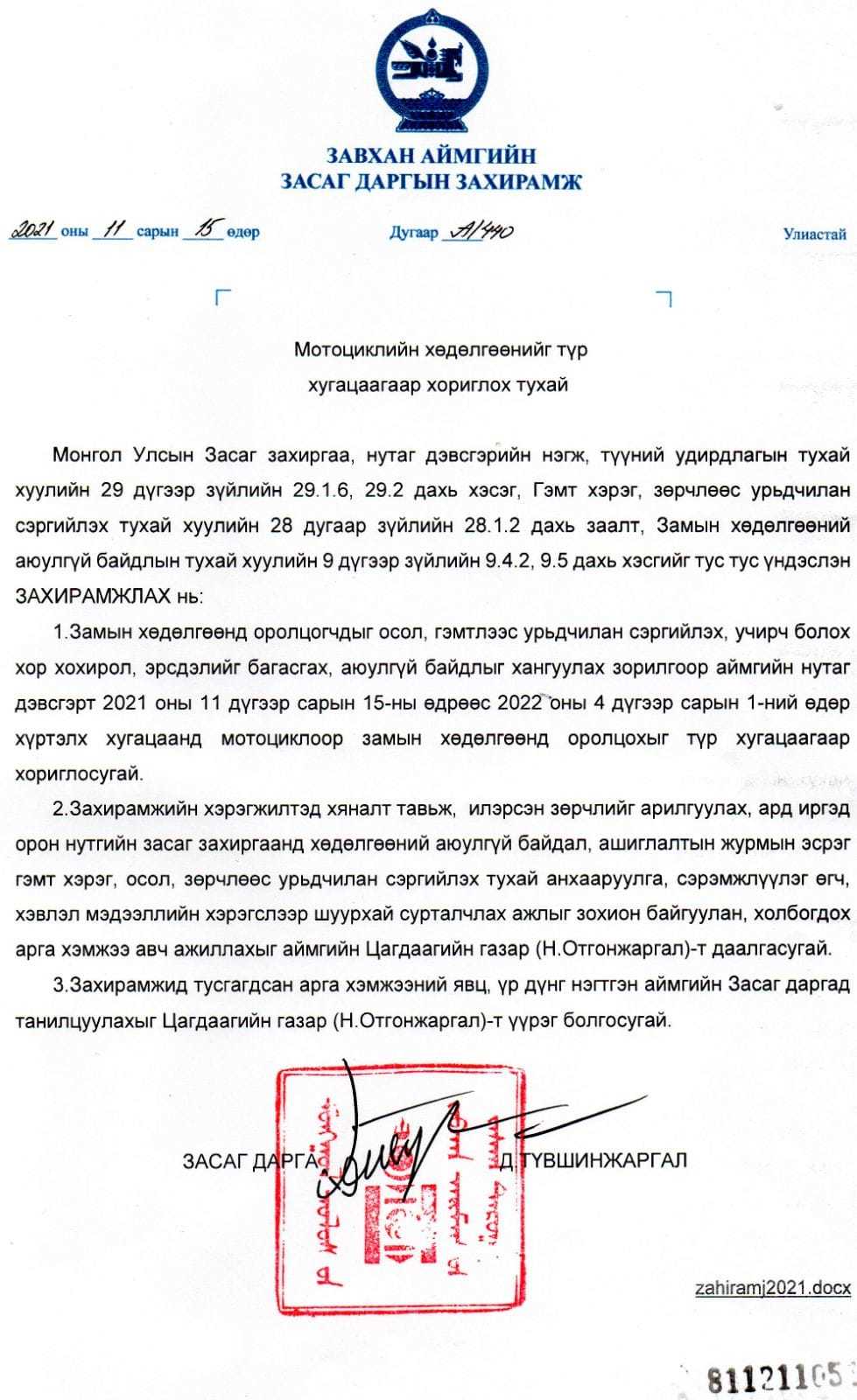 Тодруулбал, Цаг улирлын байдлаас шалтгаалан мотоциклоор замын хөдөлгөөнд оролцогчдын амь нас, эрүүл мэндийг учирч болох эрсдэлээс хамгаалах, замын хөдөлгөөний аюулгүй байдлыг хангуулах, зам тээврийн осол, хэргээс урьдчилан сэргийлэх зорилгоор Завхан аймгийн нутаг дэвсгэрт 2021 оны 11 дүгээр сарын 15-ны өдрөөс 2022 оны 4 дүгээр сарын 01-ний өдөр хүртэлх хугацаанд мотоциклоор замын хөдөлгөөнд оролцохыг хориглосон байна.