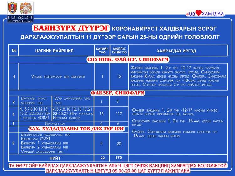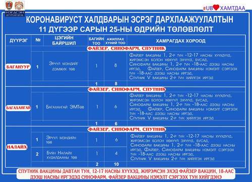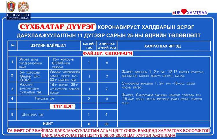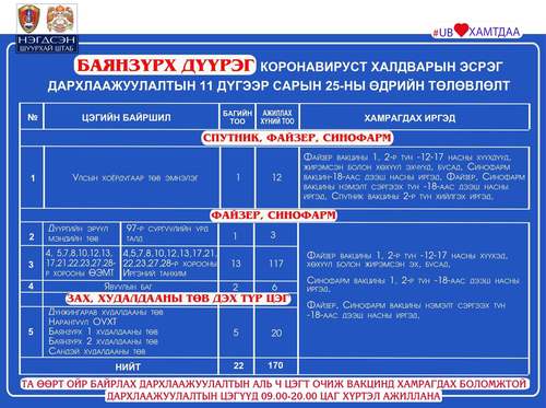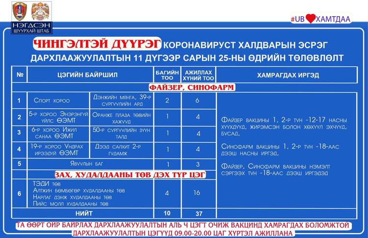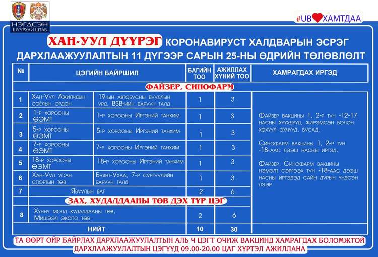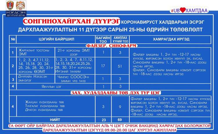 Өнөөдөр Улаанбаатар хотод явуулын 26, суурин 53, түр 23 цэгт 105 багийн 467 эмч, ажилтан ажиллаж, 6738 иргэнийг дархлаажуулахаар төлөвлөлөө. Томоохон зах, худалдааны төв, их, дээд сургуулиудад 23 түр цэг ажиллаж байна. Та өөрт ойр вакцины аль ч цэгт очиж дархлаажуулалтад хамрагдах боломжтой. Дархлаажуулалтын цэгүүд 09:00-20:00 цаг хүртэл ажиллана.