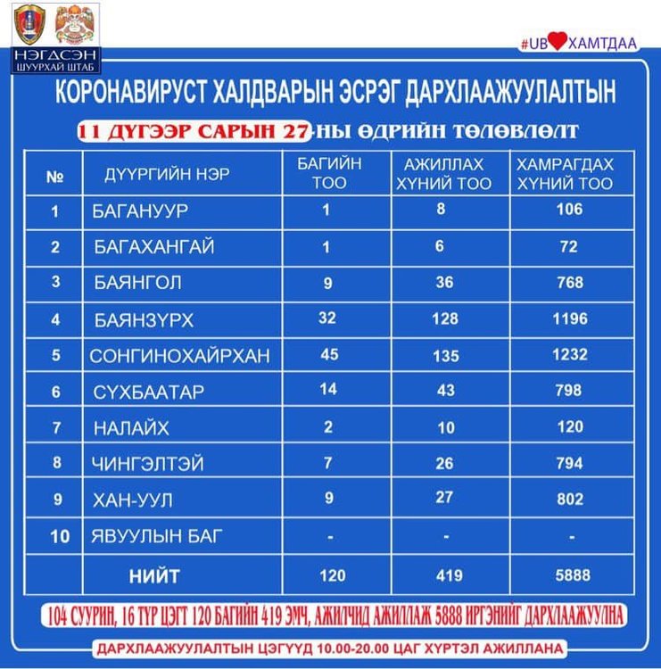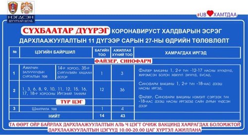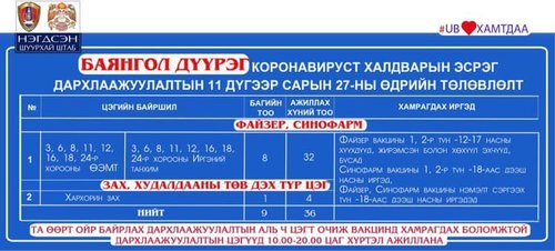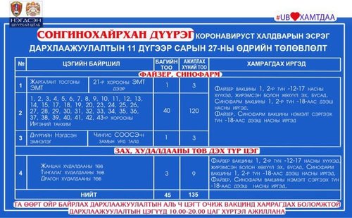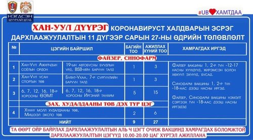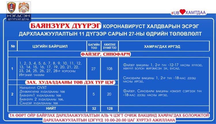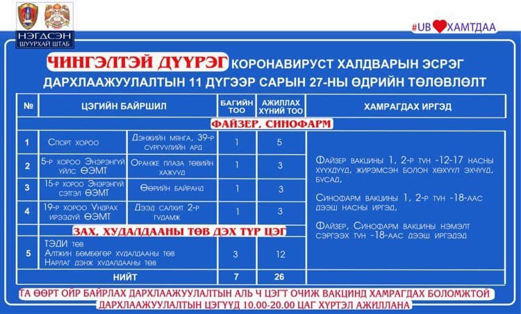 Өнөөдөр Улаанбаатар хотод суурин 104, түр 16 цэгт 120 багийн 419 эмч, ажилтан ажиллаж, 5888 иргэнийг дархлаажуулахаар төлөвлөлөө. Томоохон зах, худалдааны төвд 16 түр цэг ажиллаж байна. Та өөрт ойр вакцины аль ч цэгт очиж дархлаажуулалтад хамрагдах боломжтой. Дархлаажуулалтын цэгүүд 10:00-20:00 цаг хүртэл ажиллана.