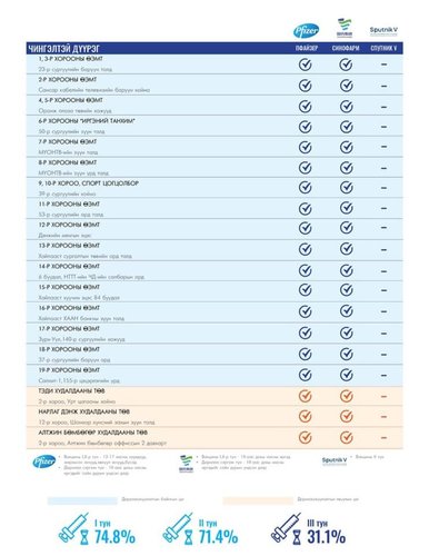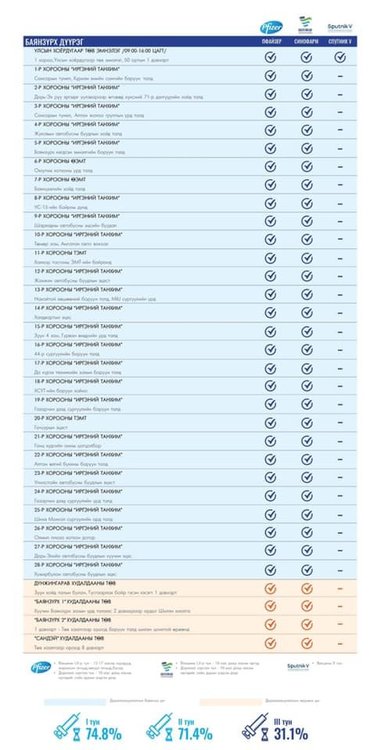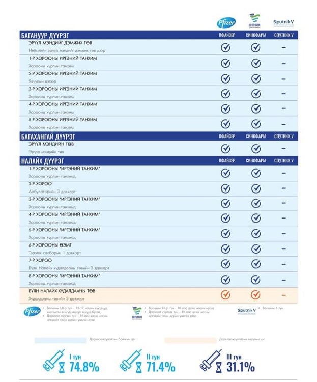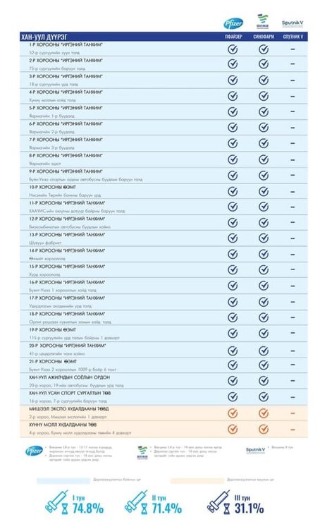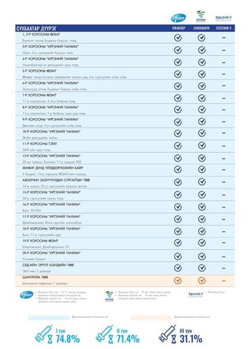 Өнөөдөр Улаанбаатар хотод 172 суурин, 37 явуулын, 16 түр цэгт 225 багийн 983 эмч, ажилтан ажиллаж, 11.980 иргэнийг дархлаажуулахаар төлөвлөлөө. Томоохон зах, худалдааны төвд 16 түр цэг ажиллаж байна. Та өөрт ойр вакцины аль ч цэгт очиж дархлаажуулалтад хамрагдах боломжтой. Дархлаажуулалтын цэгүүд 09:00-20:00 цаг хүртэл ажиллана.