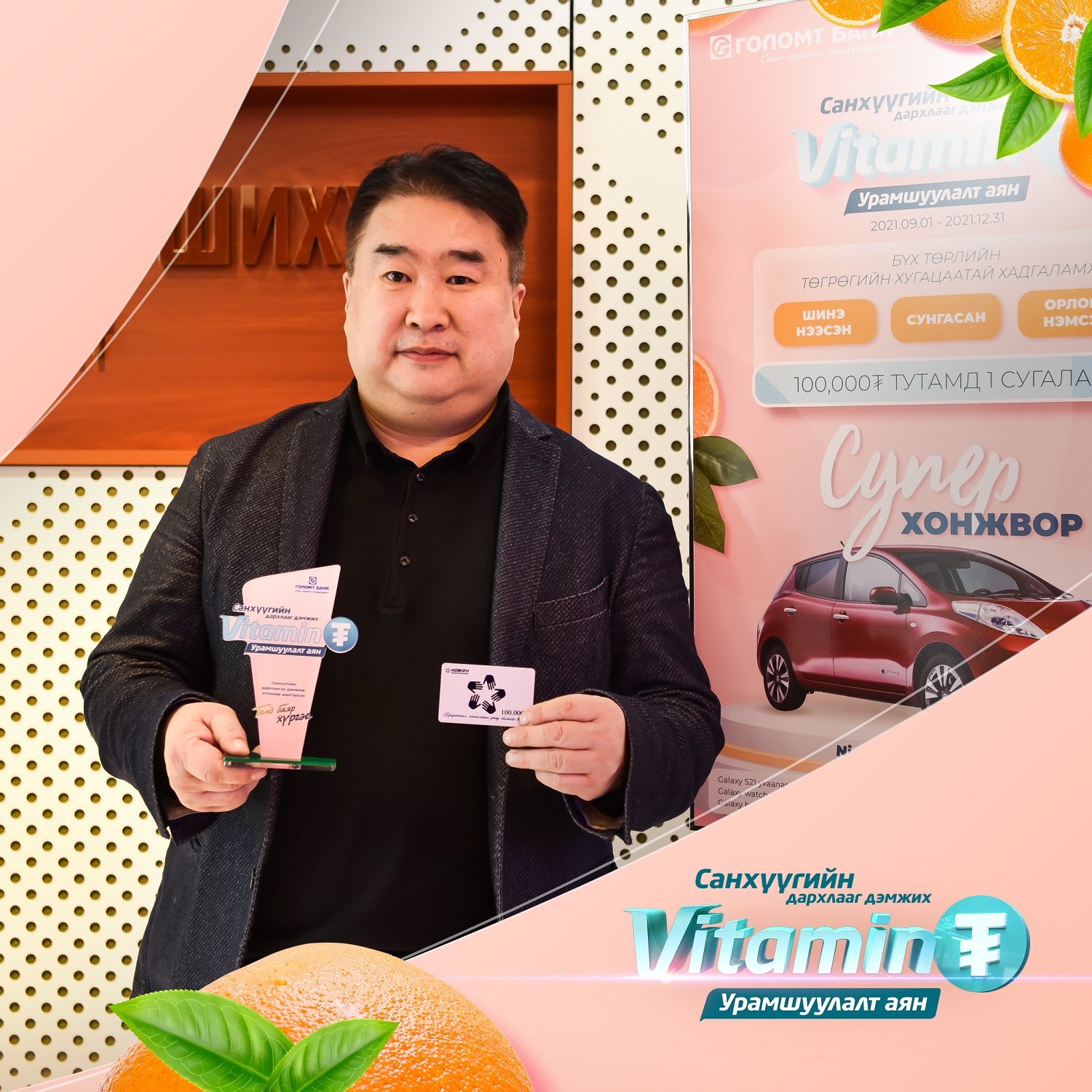 Голомт банкнаас иргэдийг хуримтлалтай болгох “Витамин ₮” урамшуулалт аяныг хэрэгжүүлж байгаа билээ. Энэхүү аяны хүрээнд Голомт банканд энгийн хугацаатай хадгаламж шинээр нээлгэсэн, орлого нэмсэн, хугацаа сунгасан тохиолдолд сугалааны эрх бэлэглэх юм. Та энэхүү сугалааны эрхээр супер хонжвор “Nissan-Leaf” цахилгаан автомашин болон бусад нэмэлт хонжворын тохиролд оролцох боломжтой.