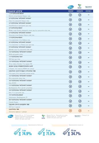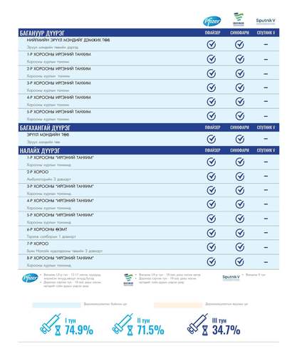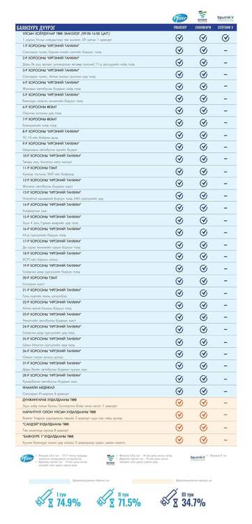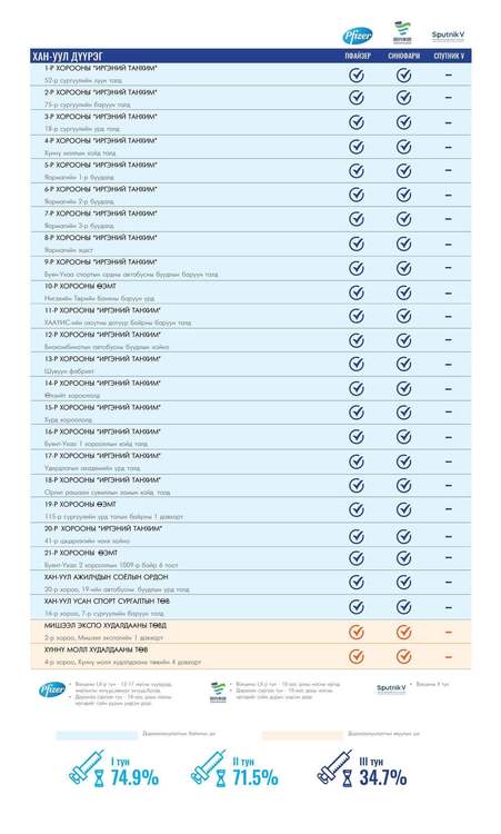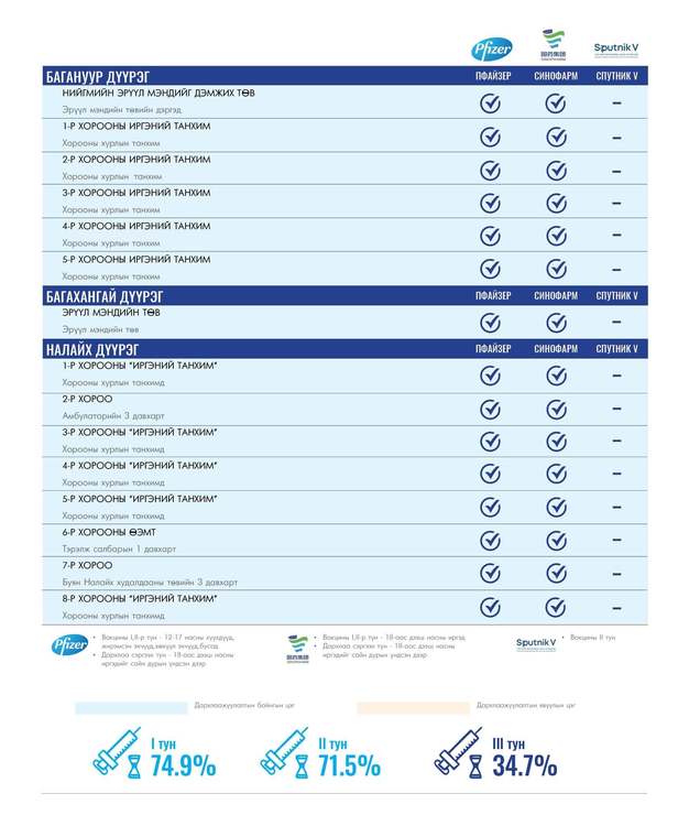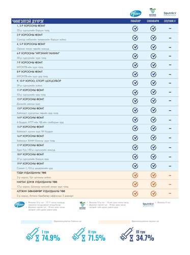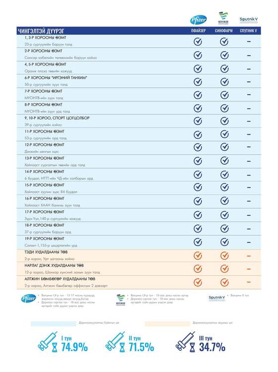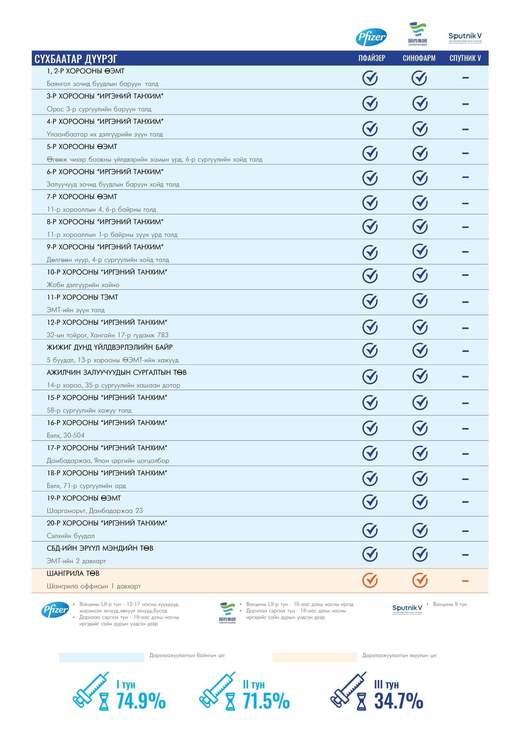 Өнөөдөр Улаанбаатар хотод суурин 173, явуулын 11, түр 14 цэгт 200 багийн 902 эмч, ажилтан ажиллаж, 10200 иргэнийг дархлаажуулахаар төлөвлөлөө. Томоохон зах, худалдааны төвд 14 түр цэг, их, дээд сургуулиудад 11 явуулын баг ажиллана. Та өөрт ойр вакцины аль ч цэгт очиж дархлаажуулалтад хамрагдах боломжтой. Дархлаажуулалтын цэгүүд 10:00-20:00 цаг хүртэл ажиллана.