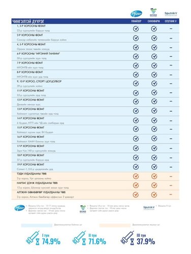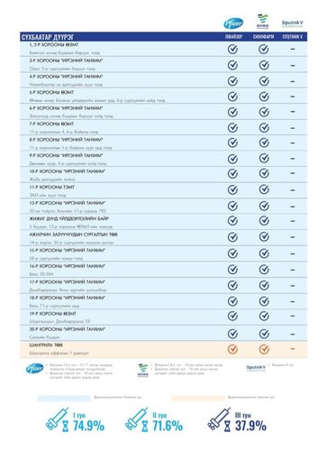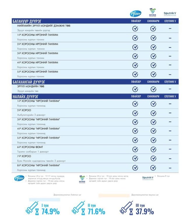 Та өөрт ойр вакцины аль ч цэгт очиж дархлаажуулалтад хамрагдах боломжтой. Дархлаажуулалтын цэгүүд 09:00-20:00 цаг хүртэл ажиллана. Дархлаажуулалтын цэгийг дүүрэг тус бүрээр танилцуулж байна.