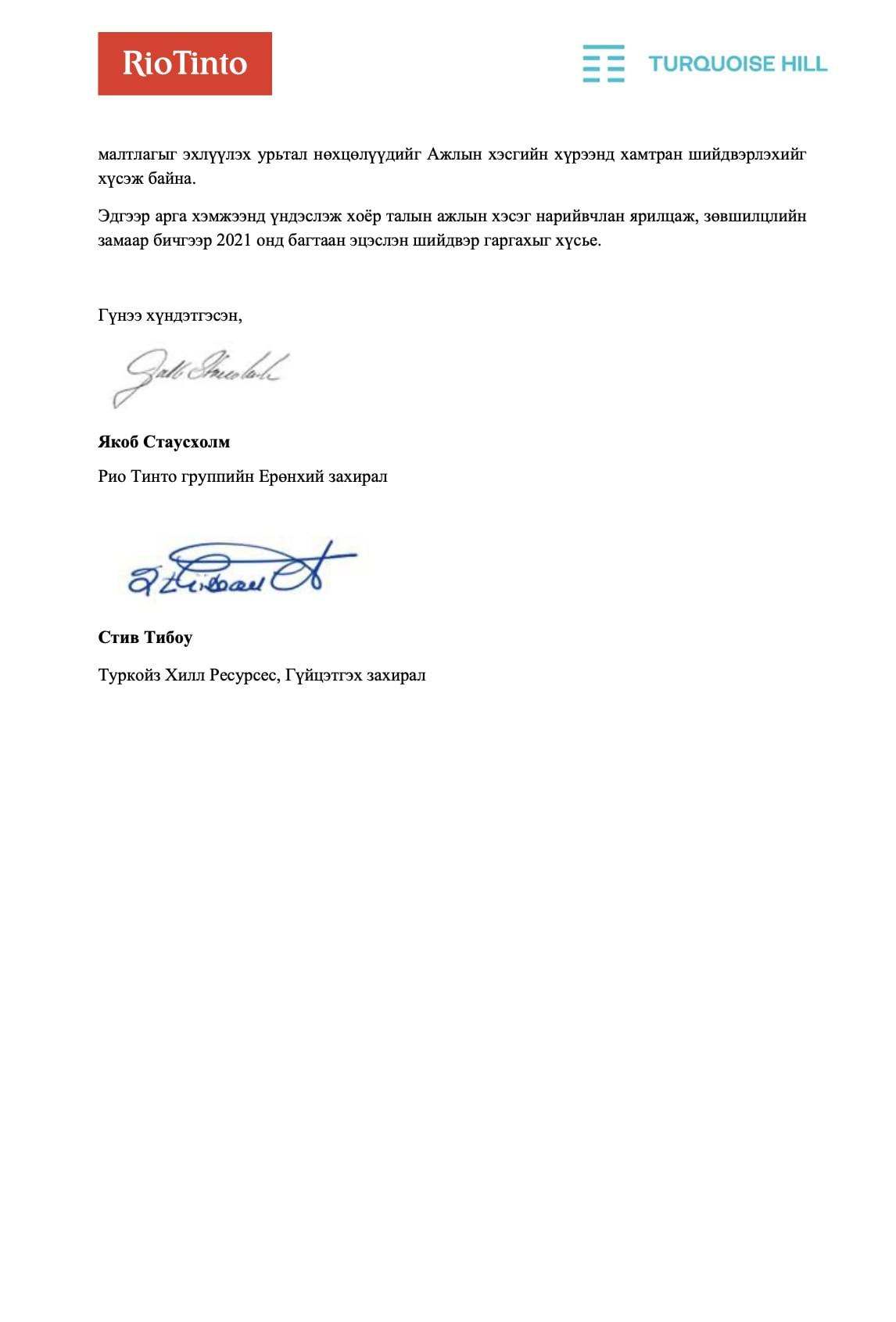 Рио Тинто, “Туркойз Хилл Ресурсес“ компанийн ТУЗ хуралдаж, дараах таван шийдвэрийг гаргаж, Монгол Улсын Засгийн газарт уламжилжээ.