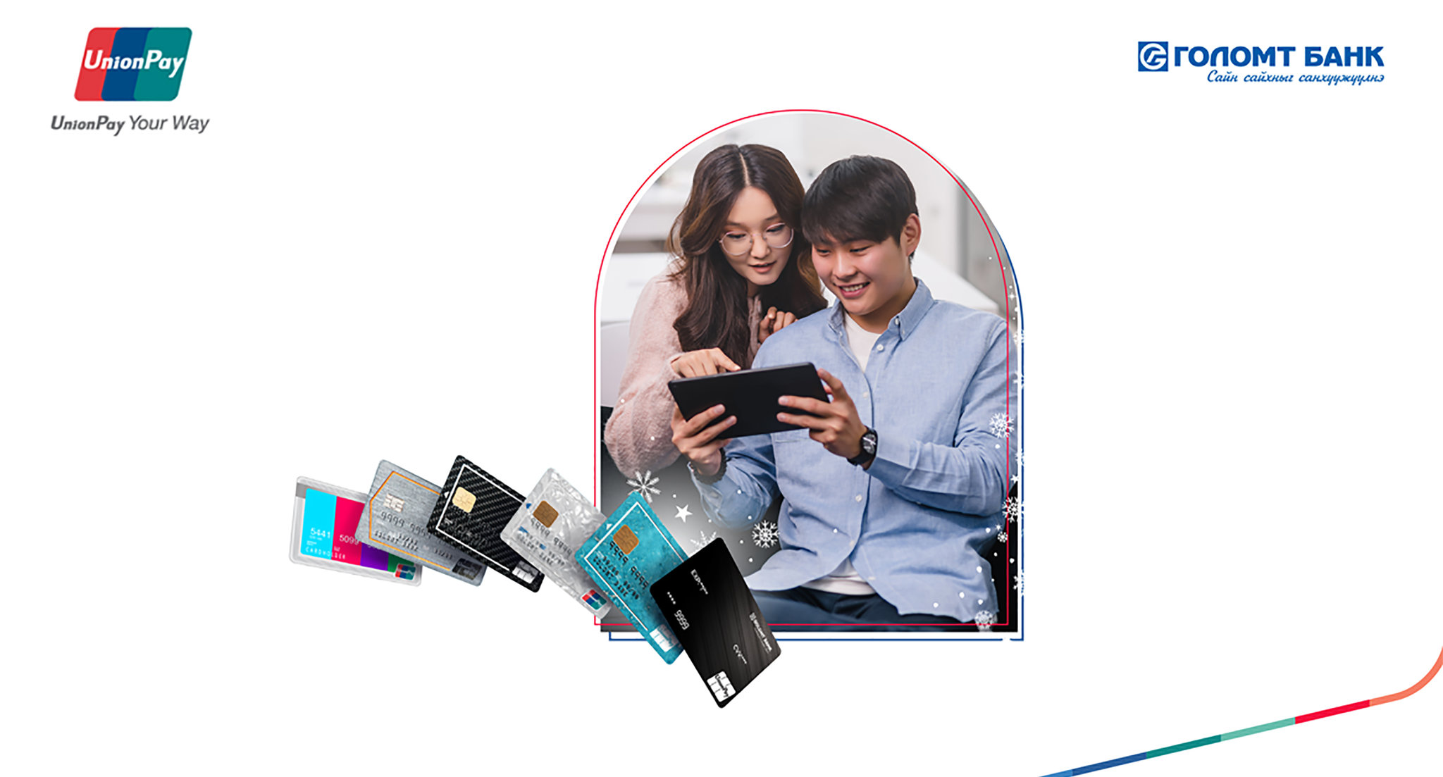 Хэрвээ та ЮнионПэй брэндийн карт хараахан авч амжаагүй бол Интернэт банк, Смарт банк, SocialPay аппликэйшн, www.cards.mn вэбсайт болон Голомт банкны салбаруудаас картаа захиалаарай.