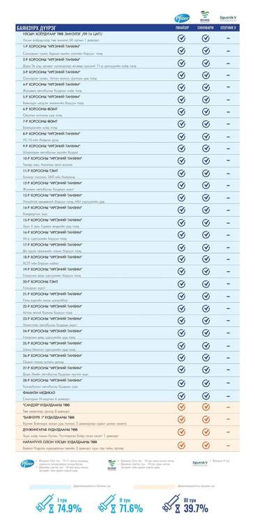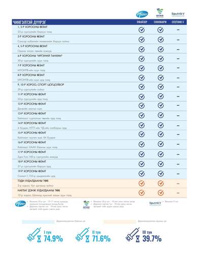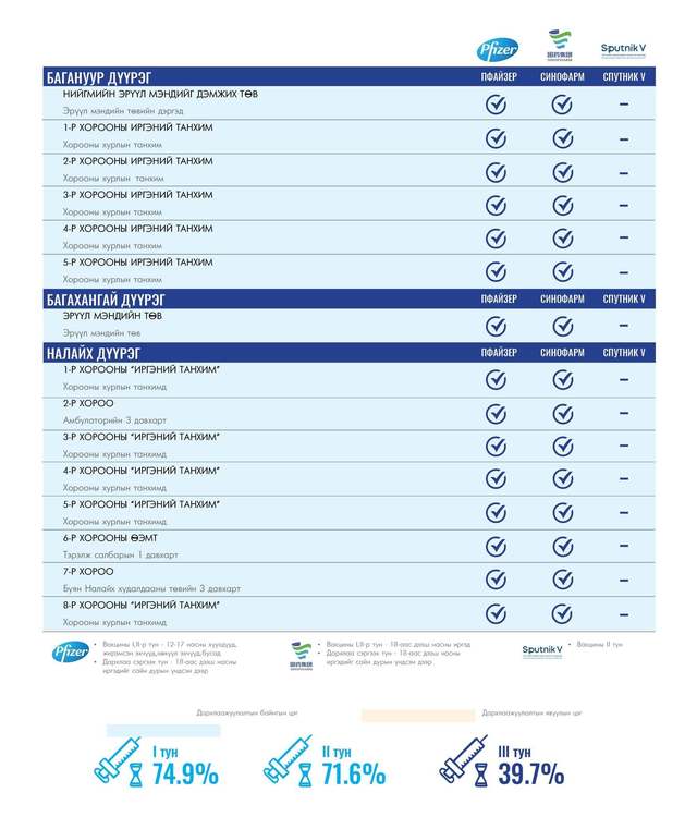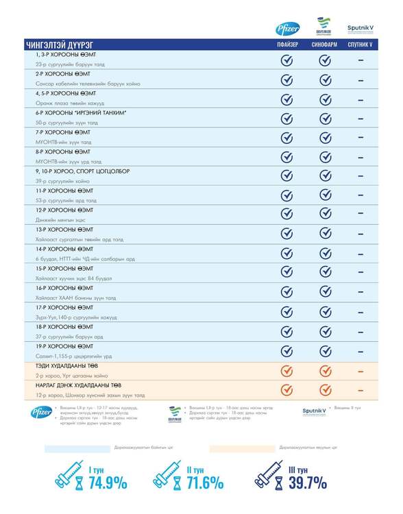 Өнөөдөр Улаанбаатар хотод 172 суурин, 14 түр цэгт 189 багийн 870 эмч, ажилтан ажиллаж, 6600 иргэнийг дархлаажуулахаар төлөвлөлөө. Томоохон зах, худалдааны төвд 14 түр цэг ажиллана. Та өөрт ойр вакцины аль ч цэгт очиж дархлаажуулалтад хамрагдах боломжтой. Дархлаажуулалтын цэгүүд 09:00-20:00 цаг хүртэл ажиллана.