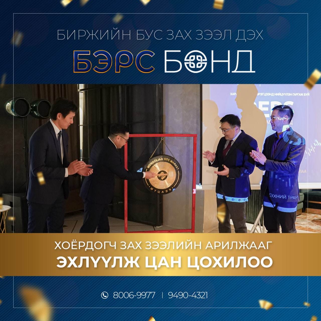 Цан цохих ёслолыг СЗХ-ны дарга Д.Баярсайхан, МҮЦАЭХ-ны Гүйцэтгэх захирал Ц.Хуяг, Голомт Капитал ҮЦК ХХК-ийн гүйцэтгэх захирал С.Ган-Эрдэнэ, Бэрс Финанс ББСБ-ын гүйцэтгэх захирал С.Отгонбат нар нээсэн юм.