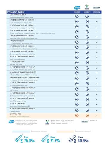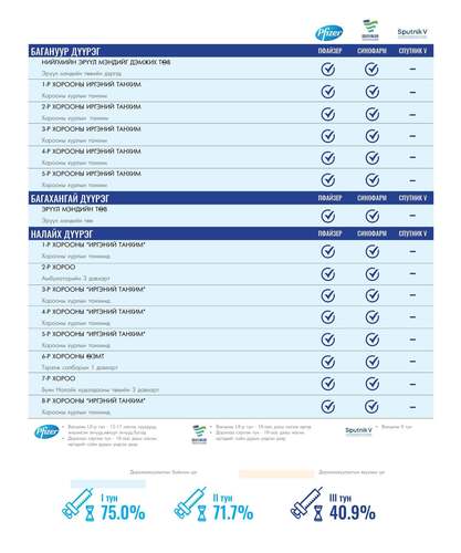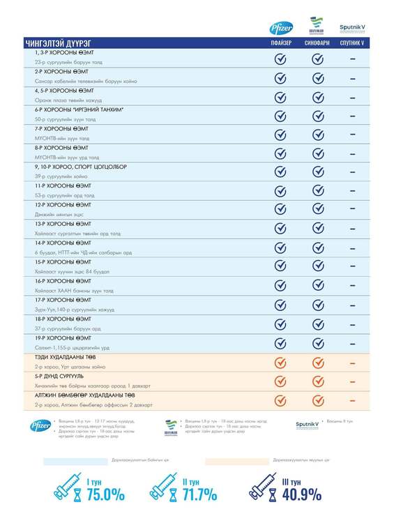 Өнөөдөр Улаанбаатар хотод 172 суурин, 14 түр цэгт 188 багийн 867 эмч, ажилтан ажиллаж, 6000 иргэнийг дархлаажуулахаар төлөвлөлөө. Томоохон зах, худалдааны төвд 14 түр цэг ажиллана. Та өөрт ойр вакцины аль ч цэгт очиж дархлаажуулалтад хамрагдах боломжтой. Дархлаажуулалтын цэгүүд 09:00-20:00 цаг хүртэл ажиллана.