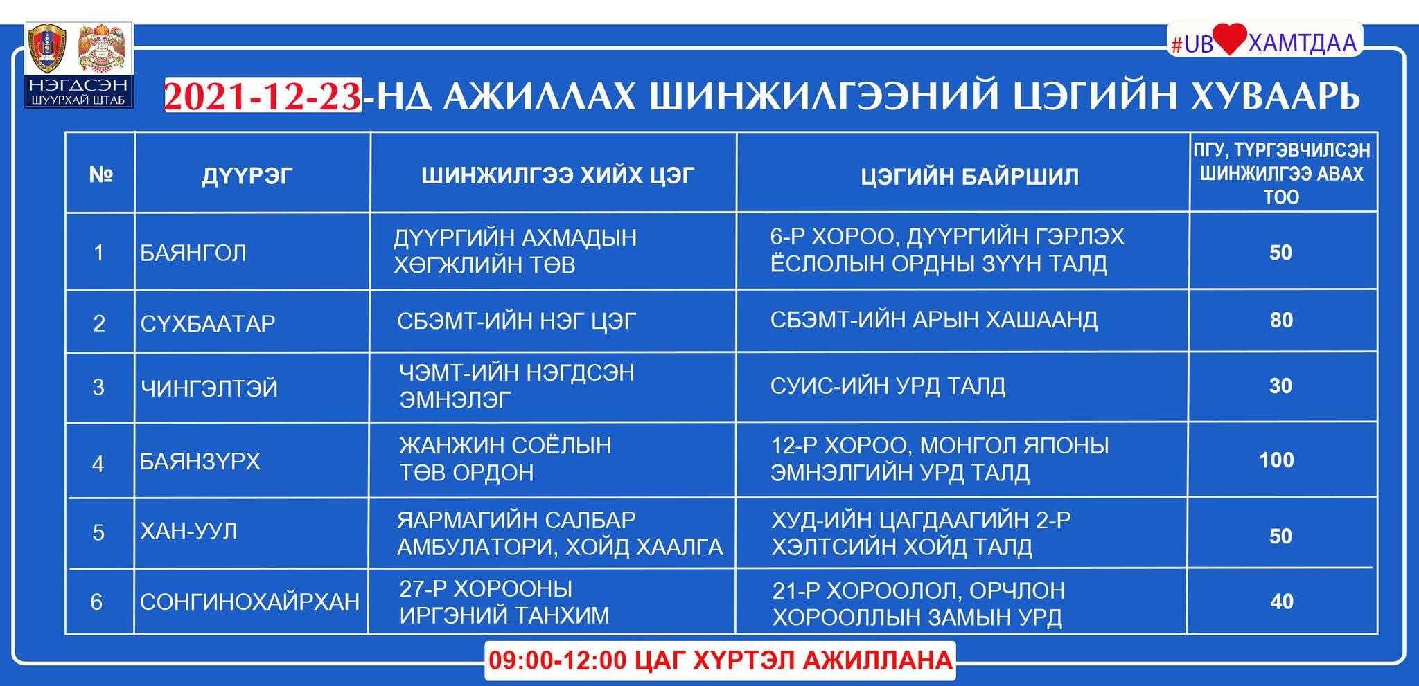 Өнөөдөр /2021.12.23/ Улаанбаатар хотод 172 суурин, 13 түр цэгт 187 багийн 863 эмч, ажилтан ажиллаж, 6000 иргэнийг дархлаажуулахаар төлөвлөлөө. Томоохон зах, худалдааны төвд 13 түр цэг ажиллана. Та өөрт ойр вакцины аль ч цэгт очиж дархлаажуулалтад хамрагдах боломжтой. Дархлаажуулалтын цэгүүд 09:00-20:00 цаг хүртэл ажиллана.
