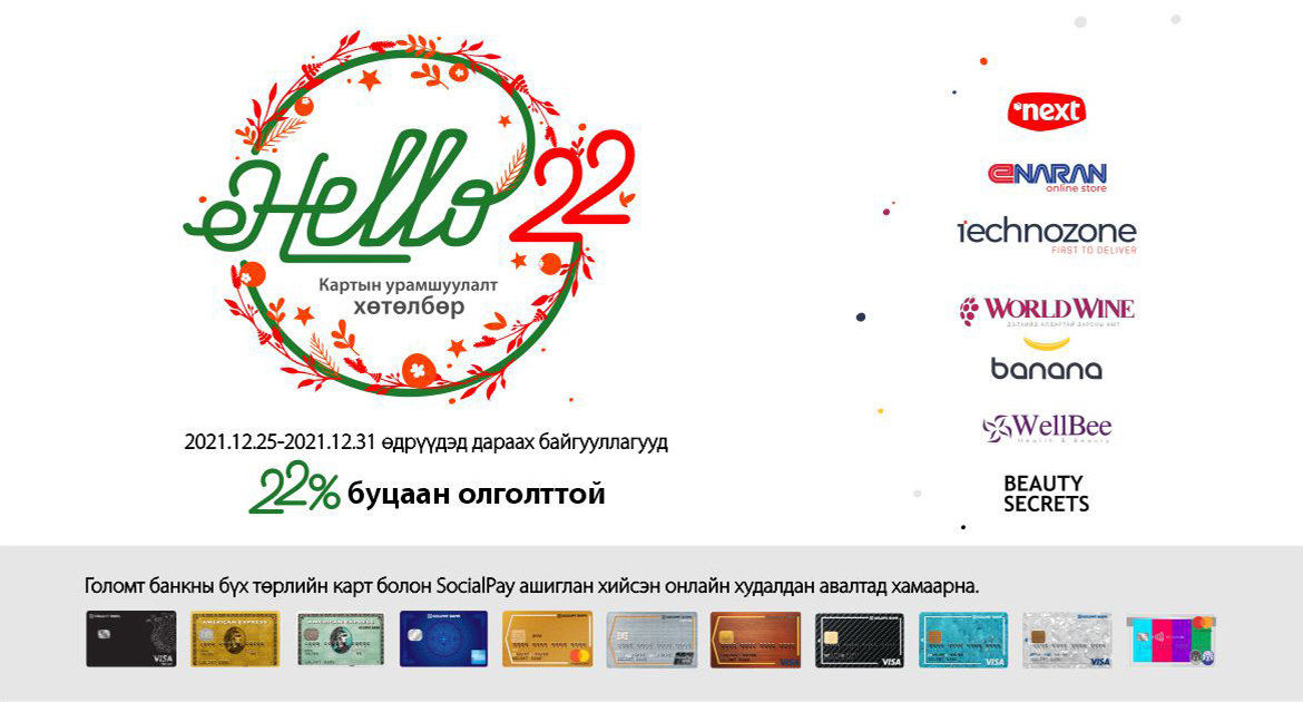 Голомт банк шинэ оныг угтан “Hello22” онлайн худалдан авалтын урамшууллыг зарлаж байна. Энэхүү урамшуулал нь 2021.12.25-2021.12.31-ний хооронд ердөө 7 хоног л үргэлжлэх юм. Hello22 урамшуулал үргэлжлэх хугацаанд та Голомт банкны бүх төрлийн карт болон SocialPay аппликэйшн ашиглан дараах 7 вэбсайтаас худалдан авалт хийгээд 22%-ийн буцаан олголт авах боломжтой.