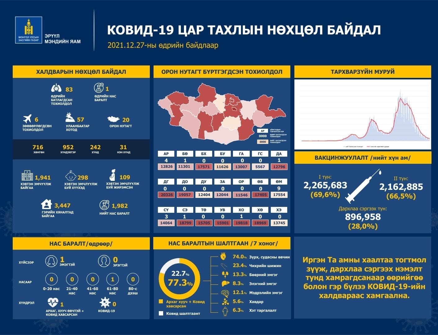 Эрүүл мэндийн яамнаас коронавирусийн халдварын 2021 оны 12 дугаар сарын 27-ны өдрийн тоон мэдээллийг гаргалаа. Сүүлийн 24 цагийн хугацаанд 83 тохиолдол батлагдсан байна. Үүний 57 нь Улаанбаатарт, 20 нь орон нутагт, 6 нь зөөвөрлөгдөн бүртгэгдлээ.