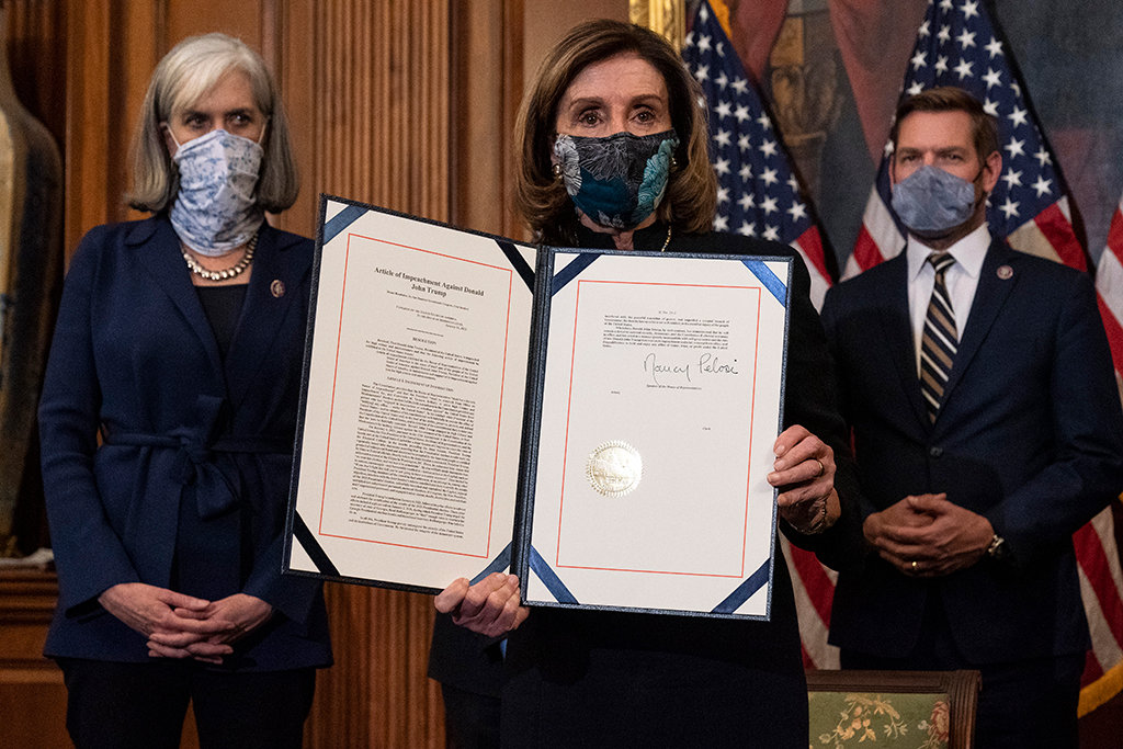Нэгдүгээр сарын зургааны өдөр Трампыг дэмжигчид Байденыг ерөнхийлөгчийн албан тушаалд батлах Конгрессын хурал болж байсан Капитоли руу дайрч, эмх замбараагүй байдал үүсгэсний улмаас хэд хэдэн хүн амиа алдсан юм. Үүнээс хэд хоногийн дараа, нэгдүгээр сарын 13-ны өдөр Төлөөлөгчдийн танхим Трампыг "Америкийн эсрэг зэвсэгт бослогод" өдөөн турхирсан гэж буруутган импичмент зарлав. Ингэснээр Трамп хоёронтоо импичмент зарлуулсан түүхэн дэх анхны ерөнхийлөгч болсон юм.