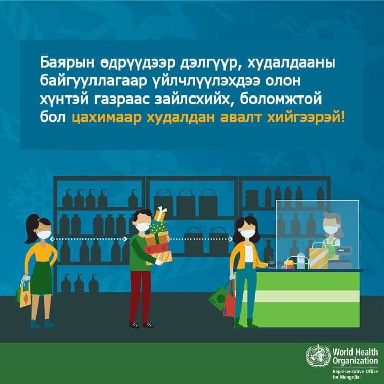 УОК-оос зөвлөмж гаргажээ. Баярын өдрүүдээр дэлгүүр, худалдааны байгууллагаар үйлчлүүлэхдээ халдвараас сэргийлэх бүх арга хэмжээг хамтад нь хэрэгжүүлээрэй.