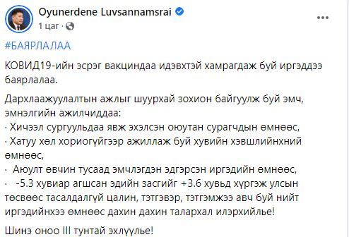 Тэрбээр өөрийн цахим хуудаснаа "Коронавирусийн эсрэг вакциндаа идэвхтэй хамрагдаж буй иргэддээ баярлалаа. Дархлаажуулалтын ажлыг шуурхай зохион байгуулж буй эмч, эмнэлгийн ажилчиддаа