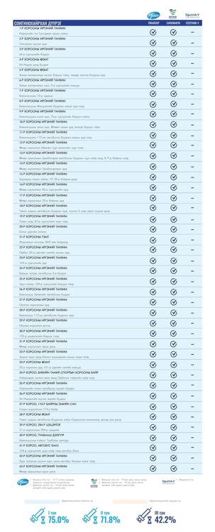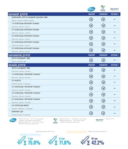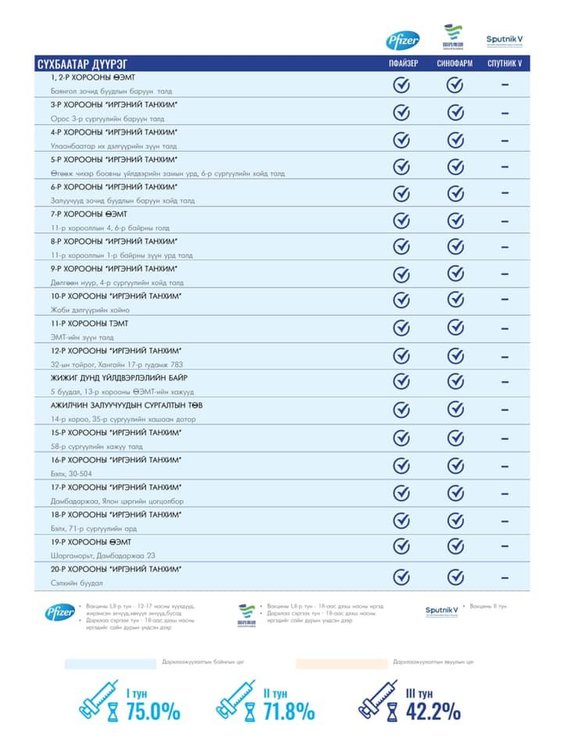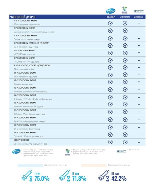 Өнөөдөр Улаанбаатар хотод 165 суурин цэгт 167 багийн 784 эмч, ажилтан ажиллаж, 4800 иргэнийг дархлаажуулахаар төлөвлөлөө. Та өөрт ойр вакцины аль ч цэгт очиж дархлаажуулалтад хамрагдах боломжтой. Дархлаажуулалтын цэгүүд 09:00-20:00 цаг хүртэл ажиллана.