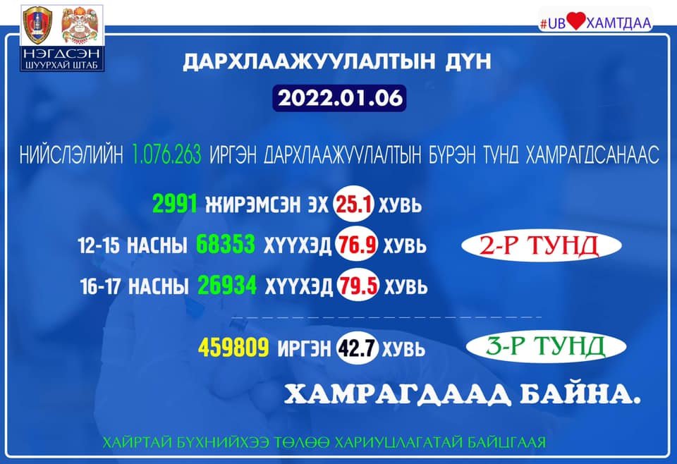 Өчигдөр нийслэлийн хэмжээнд I тунд 49, II тунд 102, нэмэлт сэргээх тунд 1588, нийт 1739 иргэнийг дархлаажууллаа. Вакцинжуулалт эхэлснээс хойш нийслэлийн нийт хүн амын I тунгийн хамралт 75.0 хувь, II тунгийн хамралт 71.8 хувь, нэмэлт тунгийн хамрагдалт 42.7 хувь байна. Зорилтот бүлгийн буюу 2991 (25.1 хувь) жирэмсэн эх, 12-15 насны 68353 (76.9 хувь), 16-17 насны 26934 (79.5 хувь) хүүхэд тус тус дархлаажуулалтын бүрэн тунд хамрагдлаа.