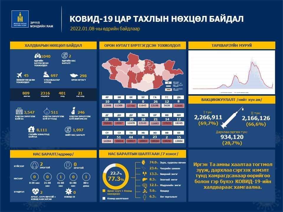 Мөн хугацаанд халдварын суурь шалтгаантай нас баралт 2 бүртгэгдлээ. Өнөөдрийн байдлаар эмнэлэгт 3547 хүн хэвтэн эмчлүүлж байна. Тэднээс 21 хүний биеийн байдал нэн хүнд байна.