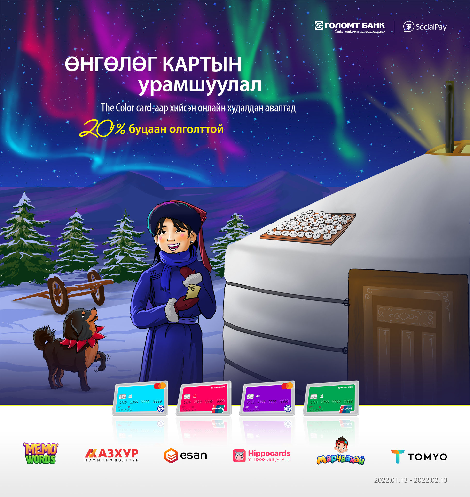 The Color Card хүүхэд, багачуудын өвлийн амралтад зориулан буцаан олголттой урамшуулалт хөтөлбөрийг зарлаж байна. The Color Card-ийн эрхэм харилцагч та картаа ашиглан дараах сонгогдсон вэбсайтуудаас онлайнаар худалдан авалт хийж 20%-ийн буцаан олголт авах боломжтой боллоо.