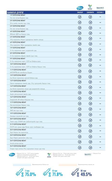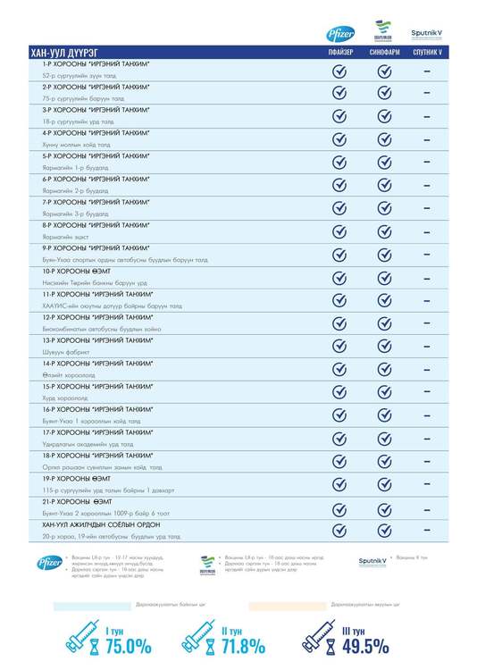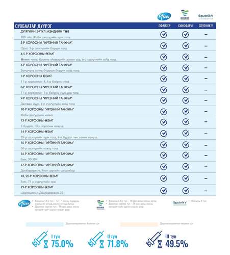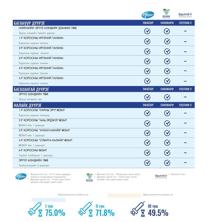 Өнөөдөр Улаанбаатар хотод суурин 160 цэгт 160 багийн 751 эмч, ажилтан ажиллаж, 8700 иргэнийг дархлаажуулахаар төлөвлөлөө. Та өөрт ойр вакцины аль ч цэгт очиж дархлаажуулалтад хамрагдах боломжтой. Дархлаажуулалтын цэгүүд 09:00-18:00 цаг хүртэл ажиллана.