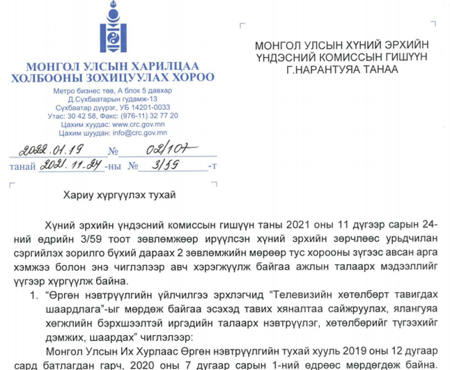 Монголын телевизүүдийн холбоо өргөн нэвтрүүлгийн телевизүүдэд Токио 2020 олимпын наадмын үеэр паралимпын наадам дамжуулаагүй шалтгаан, саад бэрхшээл гарсан эсэх, өвлийн паралимпын наадмыг ялгаварлалгүй дамжуулах талаар хэрхэн төлөвлөж байгаа талаар 2021 оны 12 сард тодруулж хариу тайлбар хүлээн авч ажилласан.