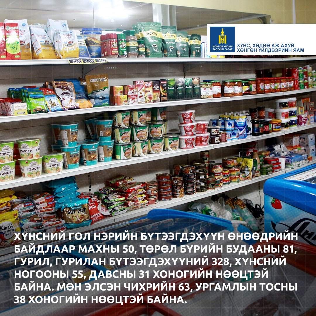 Хүнсний гол нэрийн бүтээгдэхүүн өнөөдрийн байдлаар махны 50, төрөл бүрийн будааны 81, гурил, гурилан бүтээгдэхүүний 328, хүнсний ногооны 55, давсны 31 хоногийн нөөцтэй байна.