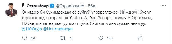 Харин тэрбээр өнөөдөр цахим хуудсаараа дамжуулж уучлалт хүссэн байна. Тухайлбал, "Өчигдөр би бухимдахдаа ёс зүйгүй үг хэрэглэжээ. Иймд зүй бус үг хэрэглэсэндээ харамсаж байна. Албан ёсоор сэтгүүлч У.Оргилмаа, Н.Өнөрцэцэг нараас уучлалт гуйж байгааг минь хүлээн авна уу" гэж бичжээ.
