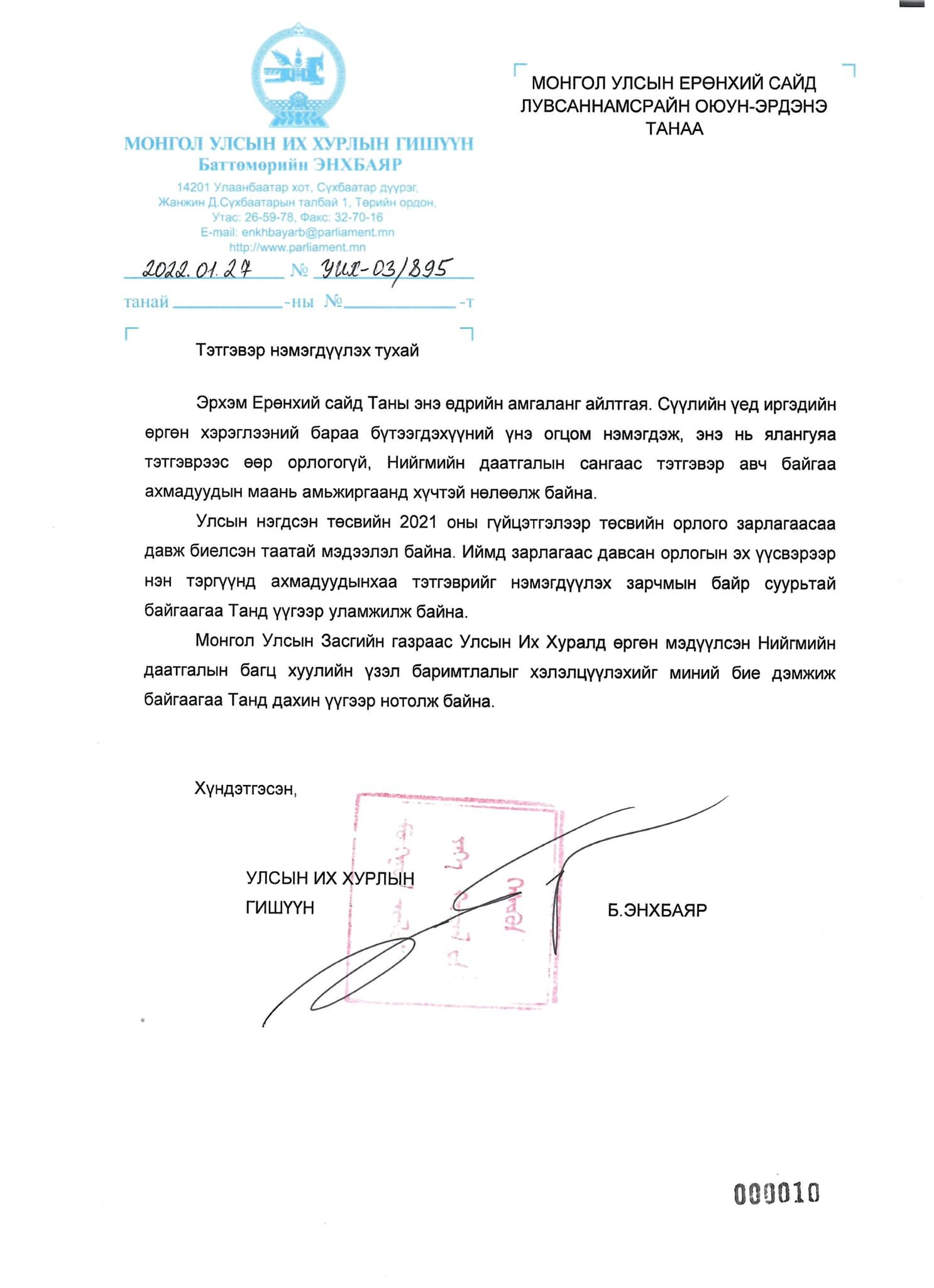 УИХ-ын гишүүн Б.Энхбаяр Ерөнхий сайд Л.Оюун-Эрдэнэд хандлаа. Тэрбээр бараа бүтээгдэхүүний үнийн огцом өсөлт өндөр настнуудын амьдралд хүндээр тусч буйг дурдаад улсын төсвийн давсан орлогыг тэтгэвэр нэмэгдүүлэхэд зарцуулах зарчмын байр суурьтай байгаагаа албан бичгээр илэрхийллээ.