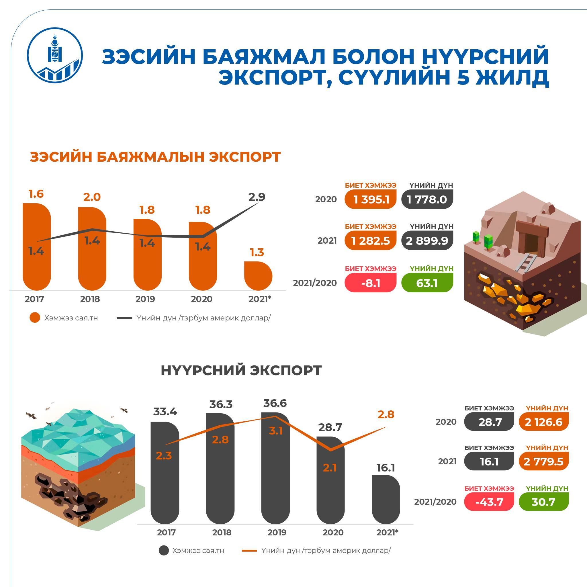 Экспорт 2021 онд өмнөх оноос 1.7 тэрбум америк доллароор өсөхөд зэсийн баяжмалын экспорт 1.1 тэрбум америк доллар, нүүрсний экспорт 652.9 сая америк доллароор өссөн нь голлон нөлөөлсөн байна.