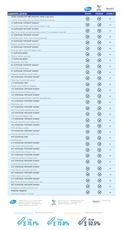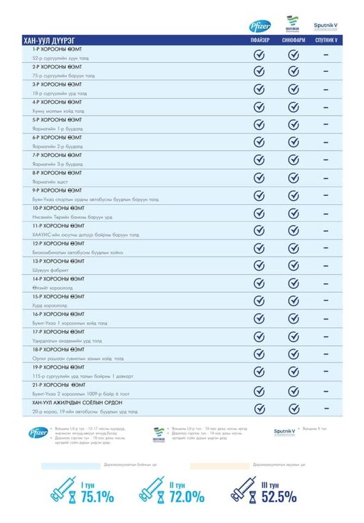 Өнөөдөр Улаанбаатар хотод суурин 157 цэгт 157 багийн 749 эмч, ажилтан ажиллана. Та өөрт ойр вакцины аль ч цэгт очиж дархлаажуулалтад хамрагдах боломжтой. Дархлаажуулалтын цэгүүд 09:00-18:00 цаг хүртэл ажиллана.