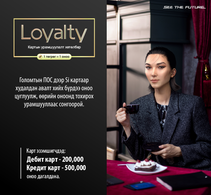 Голомт банк “See the future” уриатай, шинэ үеийн бүтээгч, манлайлагч залуучуудын Si картыг хэрэглээнд нэвтрүүлээд удаагүй байгаа билээ. Тэгвэл энэхүү Si картын хэрэглэгчдэд зориулсан LOYALTY урамшуулалт хөтөлбөрийг 2022.02.07-2022.03.07 хооронд 1 сарын хугацаатай зарлаж байна.