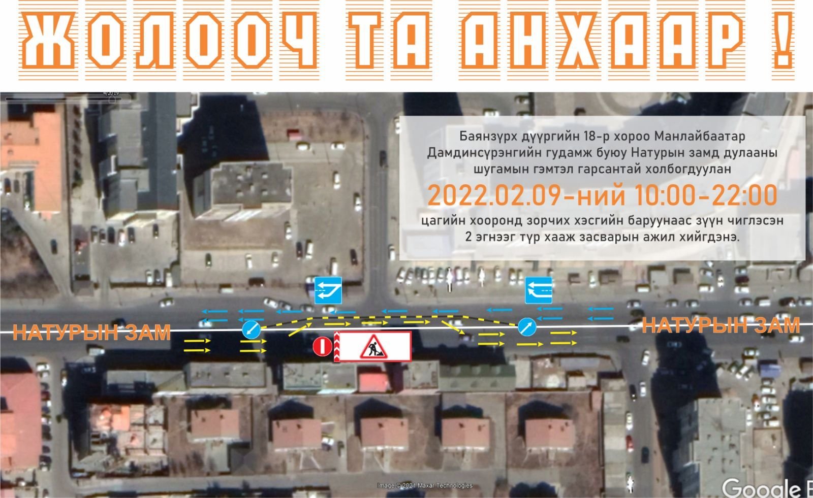 Тодруулбал,Улаанбаатар хотын захирагчийн ажлын албаны өгсөн зөвшөөрлийн дагуу Баянзүрх дүүргийн 18 дугаар хороо Манлайбаатар Дамдинсүрэнгийн гудамж буюу Натурын замд дулааны шугамын гэмтэл гарсныг яаралтай засварлах шаардлагатай болсон тул өнөөдөр 10:00-22:00 цагийн хооронд зорчих хэсгийн баруунаас зүүн чиглэлийн 2 эгнээг түр хааж засварын ажил хийгдэх тул зургийн дагуу хөдөлгөөнд оролцохыг ТЦА-аасс анхаарууллаа.