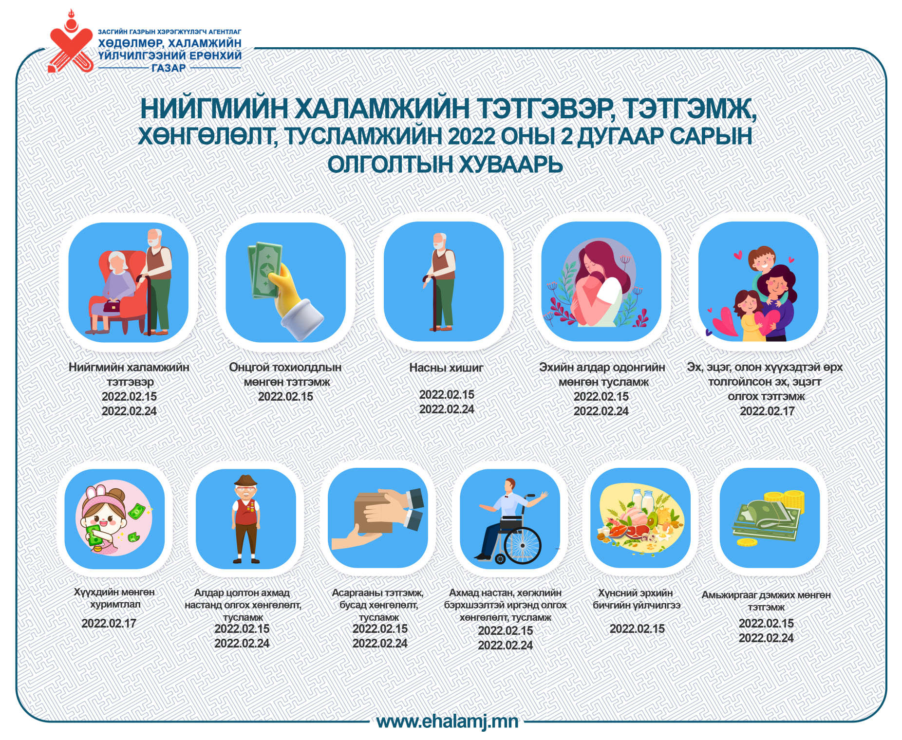 Хөдөлмөр, халамжийн үйлчилгээний ерөнхий газраас нийгмийн халамжийн тэтгэвэр, тэтгэмж, хөнгөлөлт, тусламжийн 2022 оны 02 дугаар сарын олголтын хуваарийг гаргажээ. Хүүхдийн мөнгийг 02 дугаар сарын 17-ны өдөр олгох юм байна. Харин асаргааны тэтгэмжийг 02 дугаар сарын 15-24-ний өдрүүдэд олгох хуваарь гарчээ.