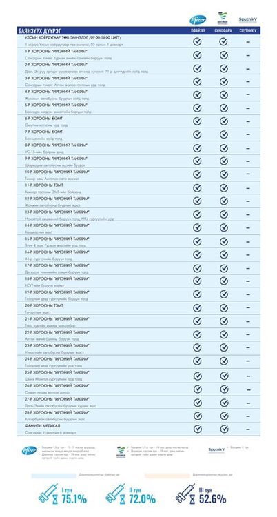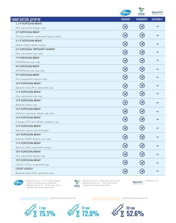 Өнөөдөр Улаанбаатар хотод суурин 157 цэгт 157 багийн 749 эмч, ажилтан ажиллана. Та өөрт ойр вакцины аль ч цэгт очиж дархлаажуулалтад хамрагдах боломжтой. Дархлаажуулалтын цэгүүд 09:00-18:00 цаг хүртэл ажиллана.